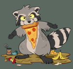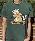 This shirt features a naughty raccoon standing in a pile of trash, proudly holding a piece of pizza.