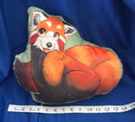 A short plush texture pillow of a red panda sitting n' blepping. About 13''.