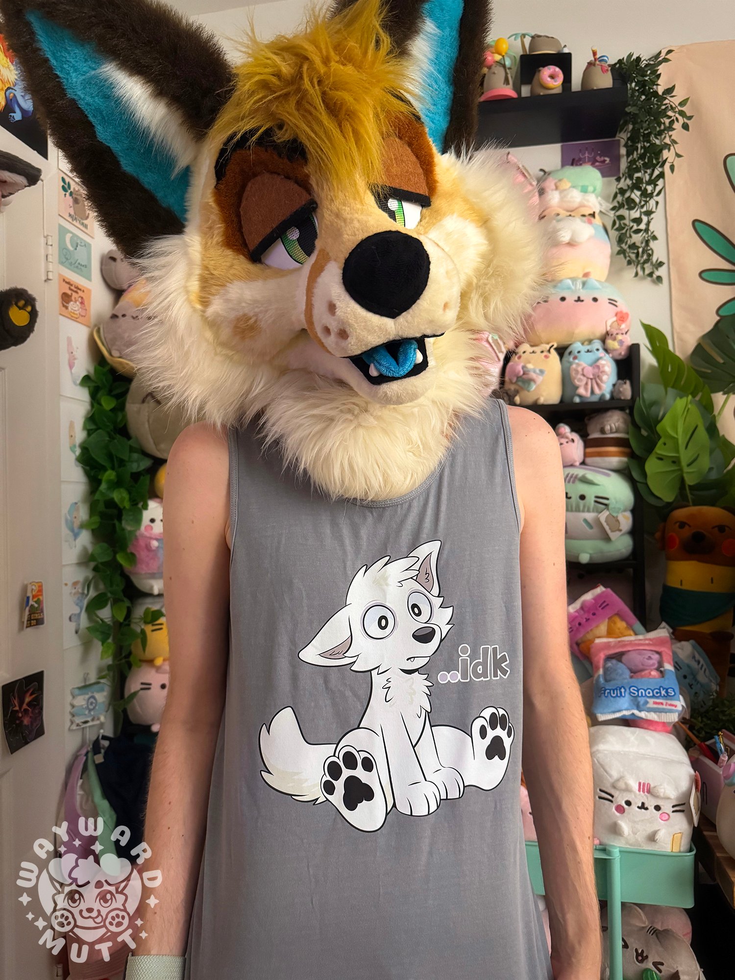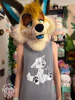 This tank top features a pupper sitting down blankly thinking "...idk" . The color is a lighter grey variant.