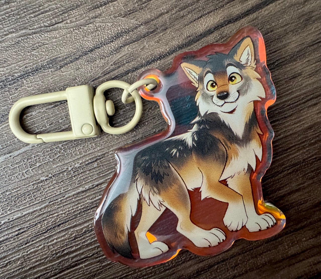 2" double sided epoxy coated acrylic keychain. Same image on both sides. Has a rainbow lighting effect so the colors vary with different angles! Beige clasp.
